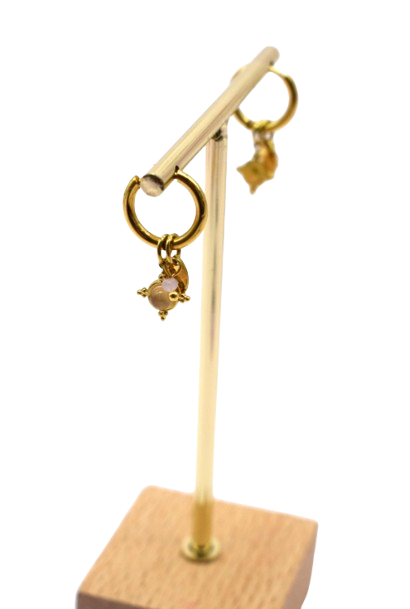 Boucles d'oreille avec pendentifs et pierres en acier inoxydable, matière qui ne rouille pas et résiste à l'eau.